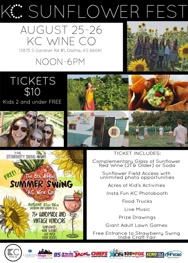 Join us at KC Wine Co. on Saturday, August 25th and Sunday, August 26th from noon -6pm, as we celebrate summer with sunflowers, wine slushies, food trucks, live music, a photobooth, and the best handmade vendors in the Midwest! We are heading to KC Wine Co. where an ACRE of sunflowers will be blooming during this fun-filled weekend. Shop for free at Strawberry Swing and take the family to the Sunflower Festival, Adults 21 and older get a glass of Sunflower Red Wine and kids get a non-alcoholic beverage! Take photos in the Sunflower Field, play giant yard games, acres of activities for the kids, plus lots of prize drawings! Tickets just $10, kids 2 and under and free.