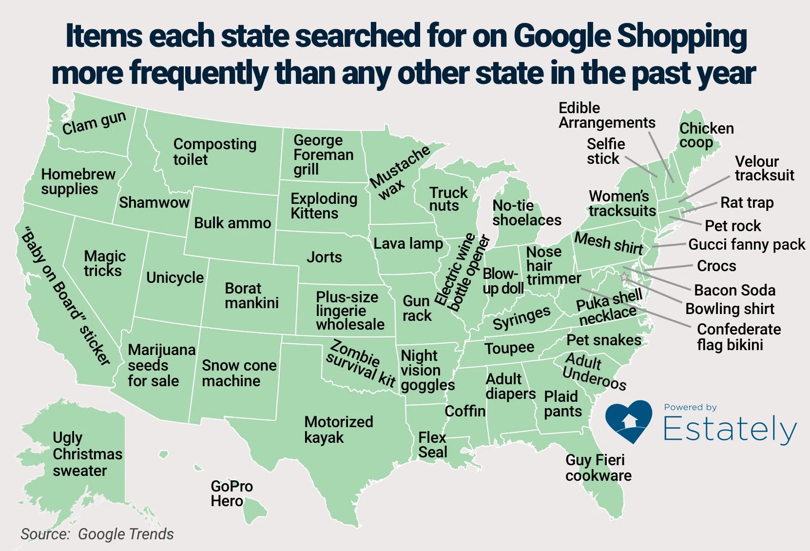 You can literally buy ANYTHING on the internet. Estately.com compiled a list of what products each state searches for the most- read the full article here.