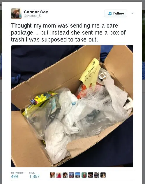 What happens when you are home on winter break and you forgot to take the trash out like your mother asked you to? You get the trash in a care package, of course! This story is soooooo funny! Nice goi...