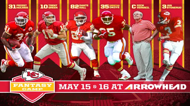 Chiefs fans, Huddle up with former Chiefs greats Trent Green, Priest Holmes, Dante Hall, Christian Okoye, Dick Vermeil and others at the first-ever Chiefs Fantasy Camp May 15th and 16th. Break down fi...